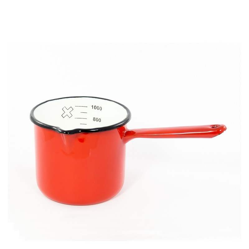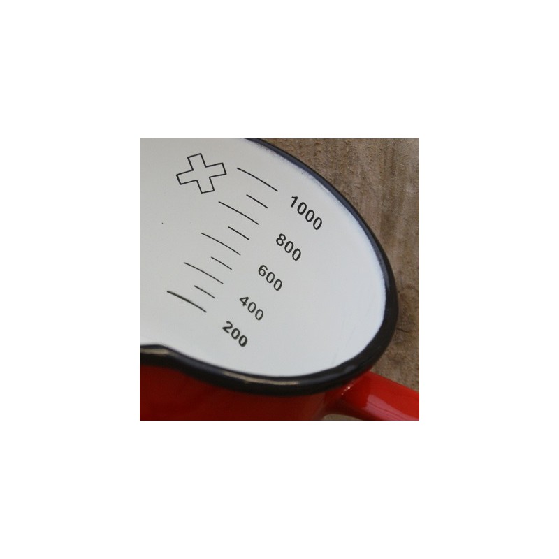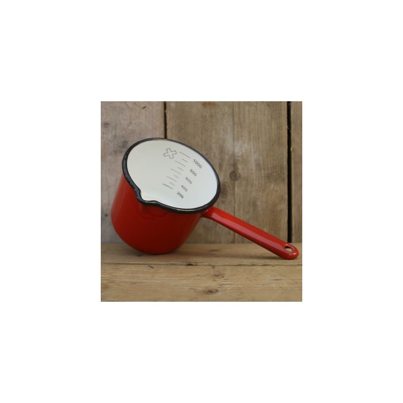 Maatbeker, steelpan en schenkpan: 3-in-1. De buitenkant is rood, de binnenkant wit met een zwarte maatverdeling. Inhoud: 1 liter.